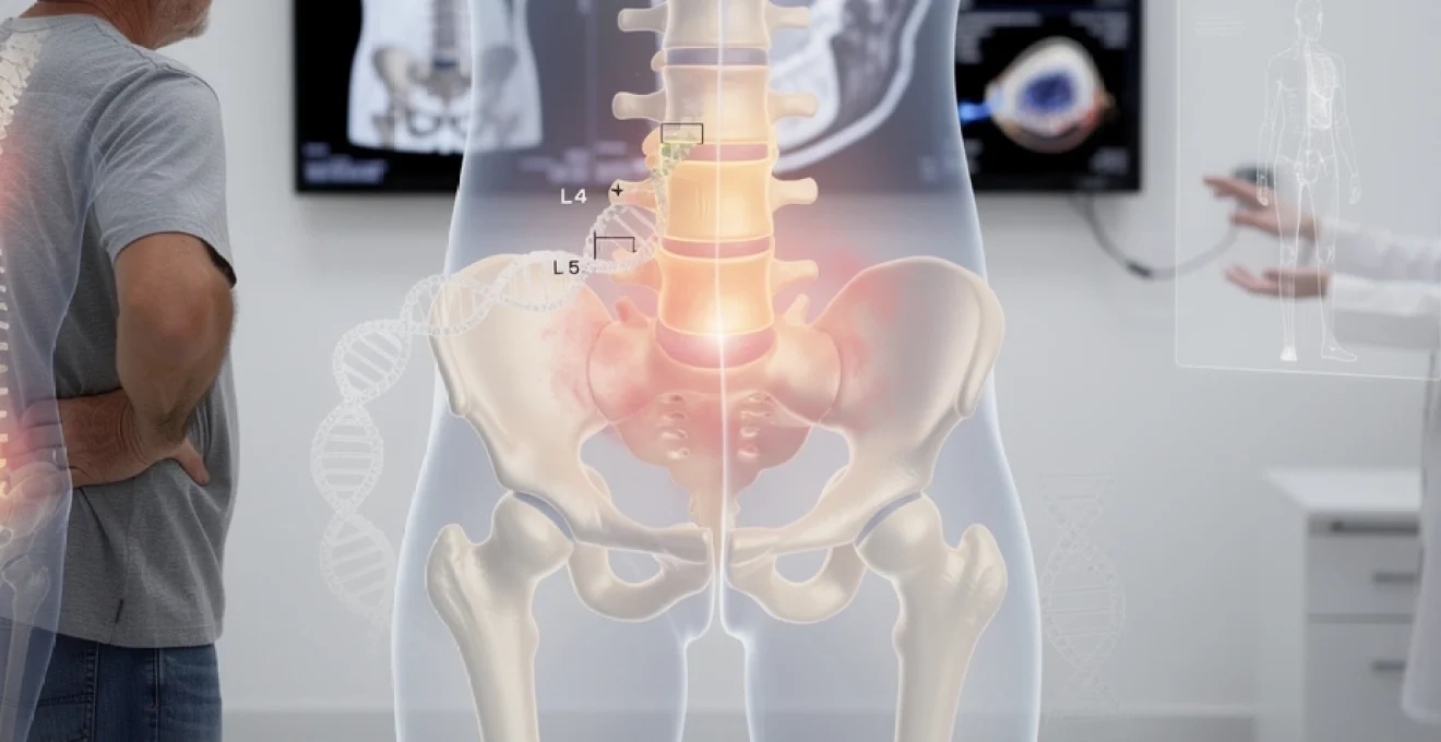La susceptibilité à la discopathie L5-S1 avec pincement discal présente une importante composante génétique. Parmi les gènes étudiés, le gène ASPN, codant pour l’aspérine (une protéine de la matrice extracellulaire), a été associé à une augmentation du risque de dégénérescence discale lombaire. Certains polymorphismes, en particulier les répétitions D14 de l’ASPN, modulent la signalisation du TGF‑β et pourraient favoriser une matrice discale plus fragile et moins apte à se réparer.